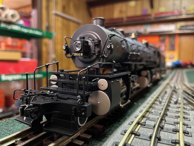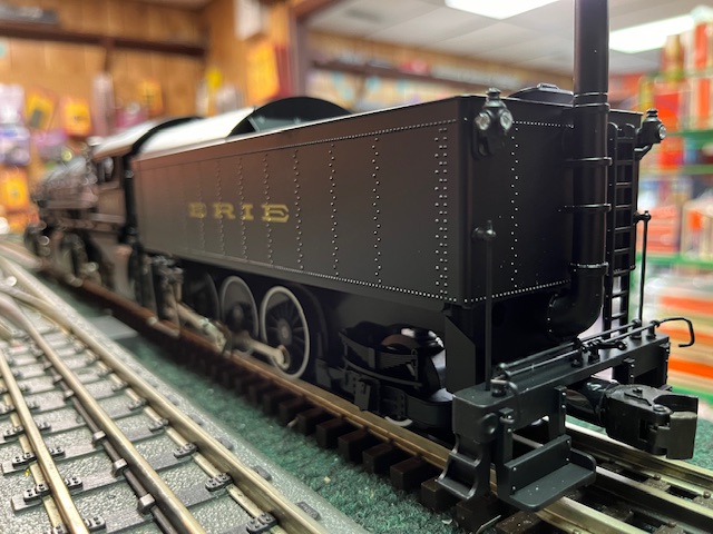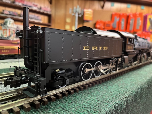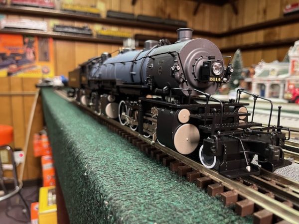 Erie’s Triplex locomotives – machines so big they inspire, intrigue, and move the mind as much as they could move freight. Built in an era when the compound Mallet design was just coming onto the scene, the Triplex took the concept a step further in attempt to use not only the locomotive’s weight but also that of the tender for traction. On paper at least, the locomotives could put 89% of their loaded weight to use and pull a train 5 miles long. They were so powerful that you couldn’t put enough weight behind them to truly test it without breaking couplers and by some accounts remain the most powerful locomotives ever built. The first Triplex entered service in 1914 as number 2603 and named after a prominent and recently retired engineer on the Erie, Matt H. Shay. The locomotive was as much of a marketing statement for the Erie as it was motive power. The locomotive performed well enough that two more were delivered in 1916 with only a few minor modifications from the original. The three were assigned as helper engines on the Susquehanna Division – best known as the line over Starrucca Viaduct. The Triplex was a compound Mallet, with high pressure steam going to the center pair of pistons first. The left piston exhausted steam to the front pair of pistons and the right to the rear which powered the wheels under the tender. The locomotives were also unique in that both the high- and low-pressure pistons were the same size, using different valve sizes to accommodate the changes in pressure. Predictably, the problem with these large beasts was not power, but appetite. The boiler would struggle to keep up pressure against the consumption of six cylinders – even if it was only directly feeding two. And although there were elements in the design to compensate for variable traction under the tender as fuel was consumed, as it ran light wheel slipping could be an issue. The locomotives stayed in service until as late as 1933. Only the Virginian made another attempt at a Triplex with a single locomotive. It was rebuilt as a smaller 2-8-8-2 soon after, however. While not a major success, they were certainly not a failure as far as experimental steam designs are concerned. More accurately, they were truly too big for their time. It would have been interesting to see the concept revisited a few decades later when technology had improved and train weights increased, but alas it never came to be. To bring this locomotive back to the O Scale market as anything less than a VISION LINE model would be a crime! We have packed every inch of this massive machine with amazing features including the all-new wheel slip simulation. If your labor rate gets too high or the fuel is running low, watch out! Those rear wheels might just start to slip. Not just a sound effect this time, the tender drive wheels have independent motor control and will actually slip under the right conditions. And when the wheels slip, of course the sounds and smoke will follow along. Other notable features include whistle steam effects, a swinging bell, road-number specific crew talk and 4-digit addressing. We’ve also made several tooling changes to model both the “production” models of 5015 and 5016 and the prototype Matt H. Shay. Few locomotives will make a bigger impression than the Triplex.